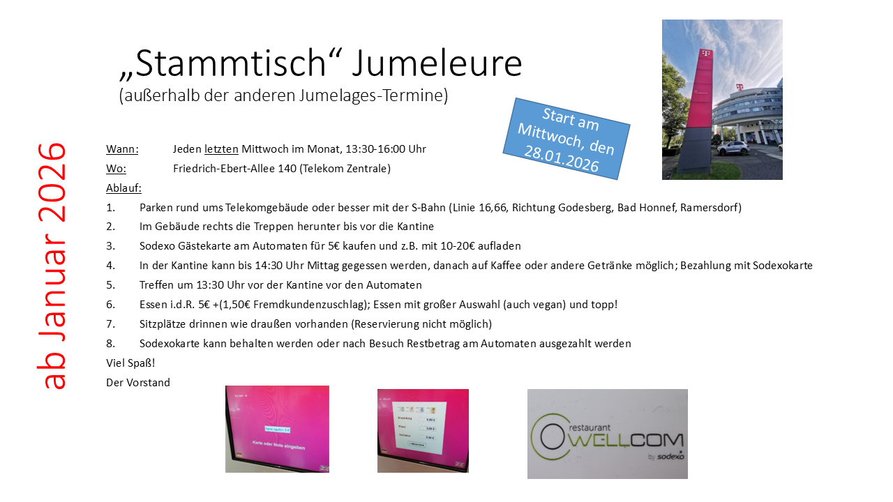 Ab Jahresbeginn 2026 wird es den Stammtisch jeden letzten Mittwoch im Monat geben. Wir treffen uns jeweils um 13.30 Uhr in der Telekom-Zentrale in der Friedrich-Ebert-Allee 140 (direkt vor der Kantine). Unser Mittwochstreff der Bonner Jumeleure wird gut angenommen. Auch wer verspätet kommt, findet uns anhand der Jumelages-Fähnchen auf den Tischen.